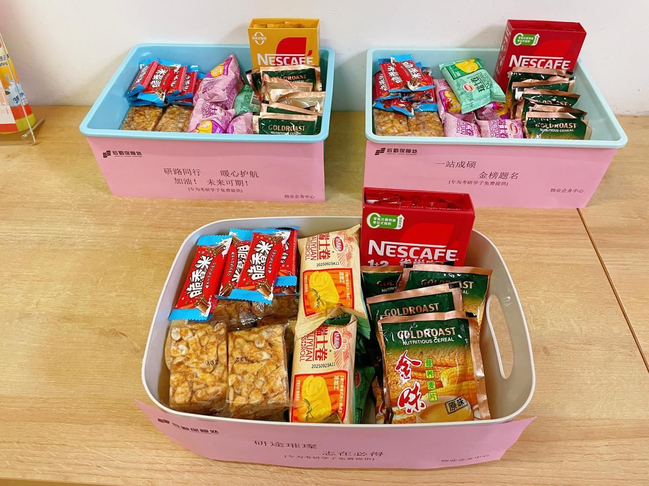便捷服务暖人心,细节之处见真情:楼宇管家将精心采购的咖啡、面包糕点、能量棒、小饼干以及麦片等食物分装到一个一个的“能量盒”,摆放在自习区的显眼位置。同时,管家们也对在场的同学们送上了“安全用电,人走断电”的温馨提示,并送上“旗开得胜、金榜题名”的真挚祝愿。这些食物饮品并非奢华,却恰到好处地满足了学子们深夜复习时补充能量、驱散寒意的实际需求,更在细微处传递出后勤服务的温度与用心。