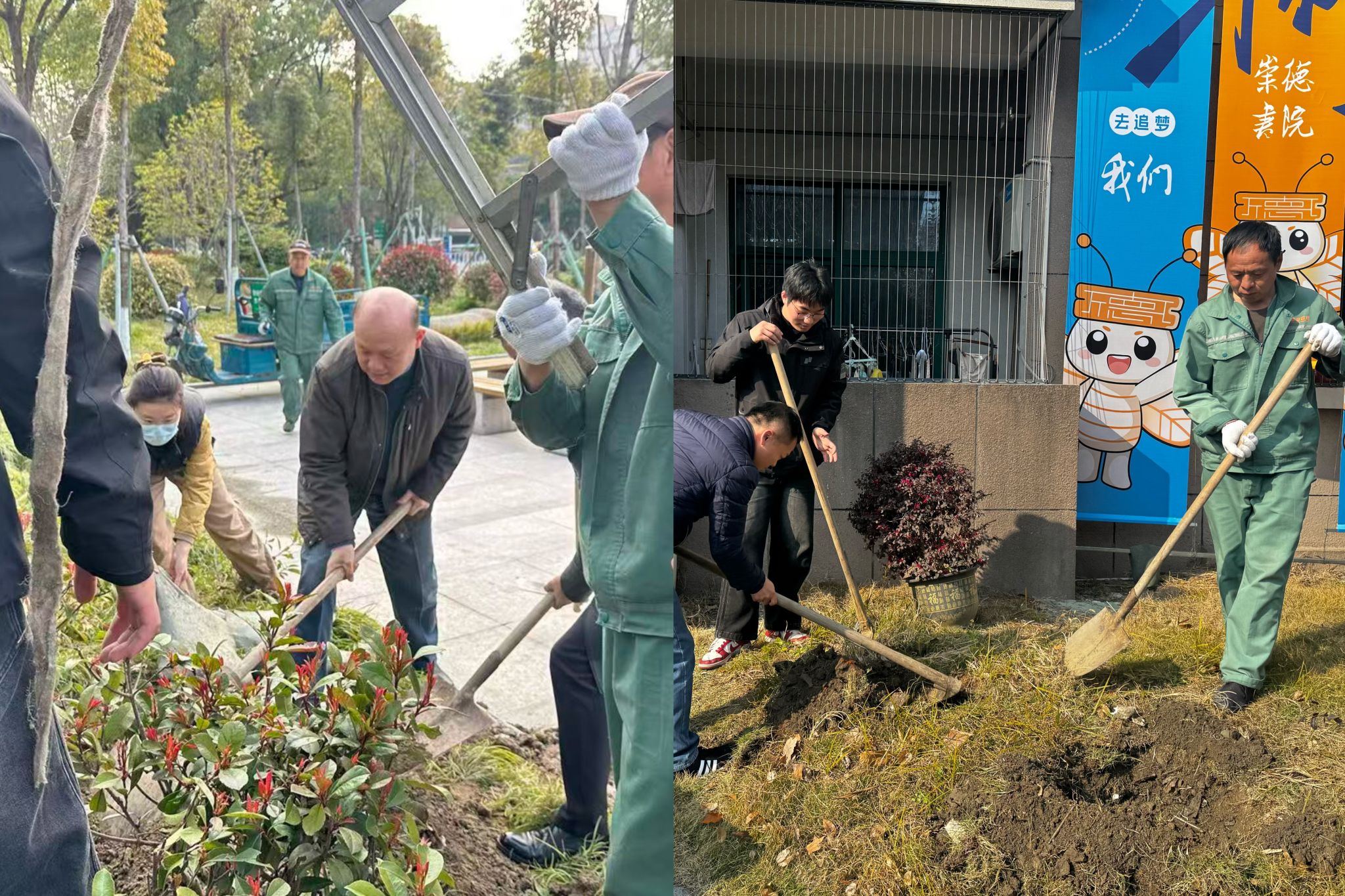 下午,物业会务中心与崇德书院在致勤东汇合,继续撒播绿色。中心提前做好了场地平整、树苗准备、工具分配等保障工作,并现场指导科学种植,确保新栽树苗的成活率。此次在宿舍区种植的是茶树和红花檵木——茶树象征着坚韧清雅,红花檵木则以其热烈的红色为宿舍区增添亮丽色彩。