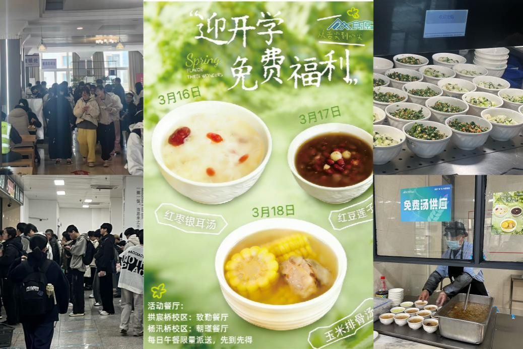 春回校园,味蕾先醒。 开学首日,各食堂窗口前便排起了长队,为迎接新学期,饮食服务中心特别推出了一系列的应季时令菜品,同时还精心准备了连续三天的“暖春汤品免费送”活动。