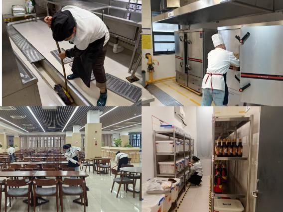 食品安全无小事,细微之处见担当。开业前一周,饮食服务中心组织全体员工对各餐厅开展了全方位、无死角的卫生清理与消杀。学生返校前,由分管领导吴汉龙带队,并邀请食安专业专家开展了两校区餐厅后厨大检查。