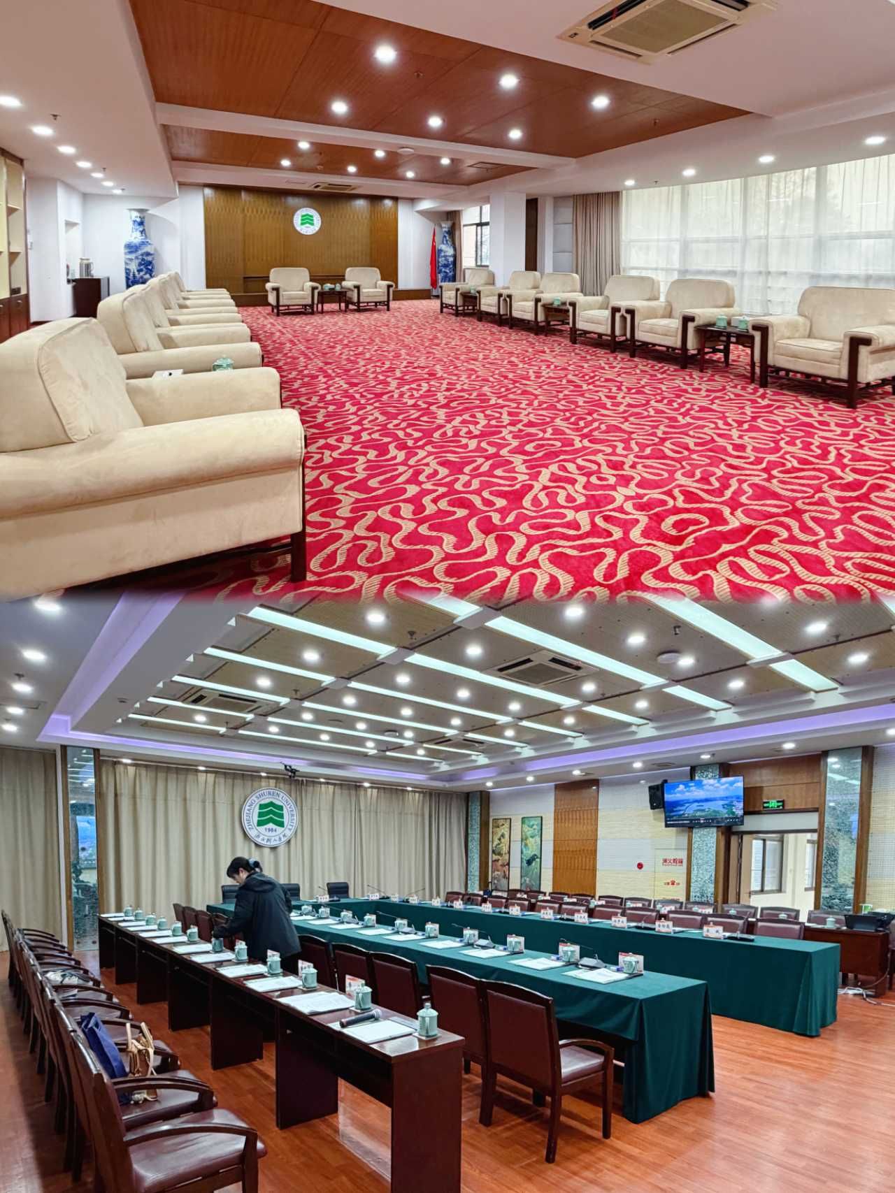 在基础布置完成后,团队围绕服务体验反复打磨:现场模拟参会场景,反复演练茶水递送动作;实地排查会场动线,发现桌椅间距影响服务便捷度后,当即将桌子统一后移 20 公分,优化空间布局;同时逐一试坐每一把座位,细致检查座椅稳固性。此外,主动协同水电保障中心完成3个会议室的照明、空调等硬件设施排查,确保设备平稳运行。