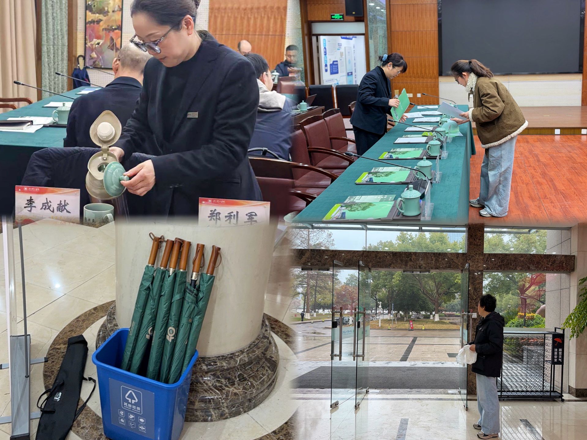 雨天温情,当好嘉宾“贴心人”。团队提前研判天气变化,根据会议当日降雨预警,靠前服务,在综合楼入口及接待区域备好爱心雨伞、雨伞袋,方便参会嘉宾取用与收纳。并安排管家全程做好引导陪护。