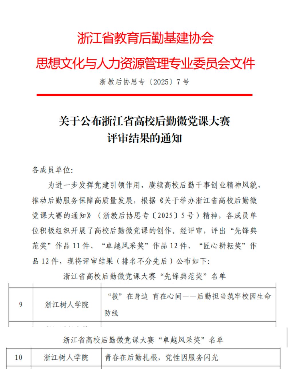 近日,浙江省高校后勤微党课大赛评审结果正式公布,浙江树人学院后勤保障处第四党支部郎佳欢主讲的《“救”在身边 育在心间——后勤担当筑牢校园生命防线》荣获“先锋典范奖”,第一党支部项智燕主讲的《青春在后勤扎根,党性因服务闪光》斩获“卓越风采奖”。后勤保障处党总支推荐的2个作品均获得奖项,这既是对后勤保障处党建工作的高度认可,更是“党建统领、融合赋能、服务育人” 的生动落地。