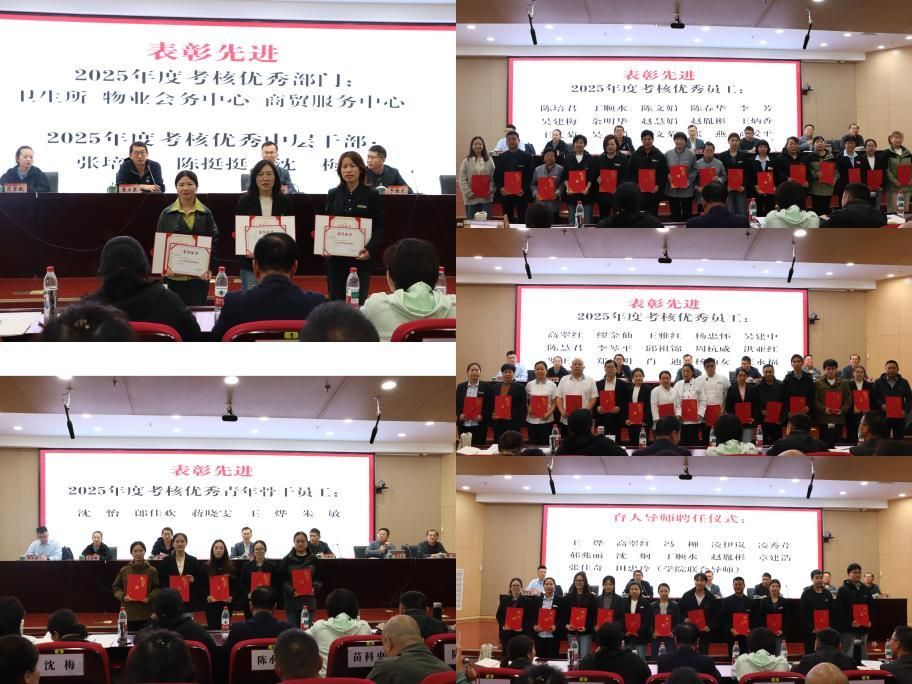 会议首先对2025年度后勤保障处先进集体与优秀个人进行表彰,副校长俞海标及后勤保障处班子成员为获奖代表颁奖,并为第三批后勤育人导师颁发聘书。会议鼓励全体员工以先进为标杆,传承责任担当,立足岗位发挥示范引领作用,为学校高质量发展提供后勤力量;同时,深化服务育人功能,助力学生全面成长;营造全员育人的良好氛围。