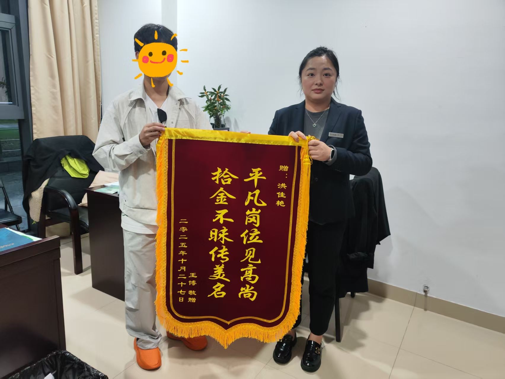 近日,物业会务中心收到一名同学专程送来的锦旗,对员工洪佳艳拾金不昧的善举表示感谢。这一暖心事件,也成为中心践行"三抓三比”、锤炼优良作风的生动缩影。
