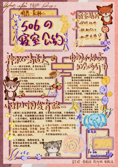 同学们踊跃参与,围绕安全守则、卫生约定、作息共识、相处之道等核心维度,与室友共商共议,创作出了一大批形式新颖、内容充实的原创公约作品。这些作品不仅条款清晰,更在设计上融入了巧思与温情,充分展现了学生们对美好居住环境的共同期许。