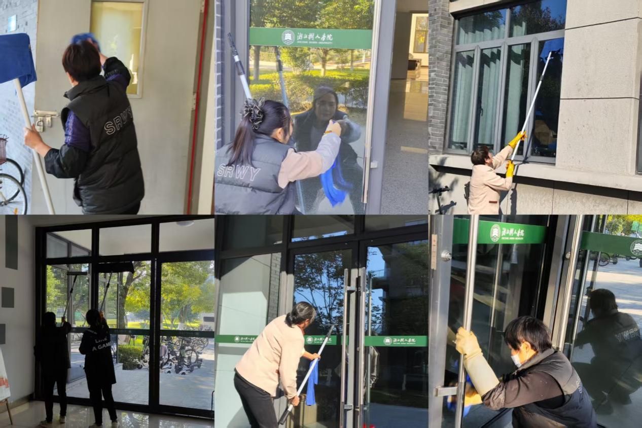 在绿化美化方面,中心围绕“迎评估、靓校园”主题同步实施升级。不仅对全校绿植进行统一精细化修剪,还系统开展了杂草清除、河道疏通与草花更新等工作。为打造亮点,对校门口景观品质进行了专项提升,特别在拱宸桥南校区校门口以 4000 株角堇花卉精心勾勒校徽图案,打造地标花境,让校园入口成为亮眼风景,同时配合教务处完成校史馆、艺术学院等 5 处参观路线的绿植布置,为评估注入绿色动能。