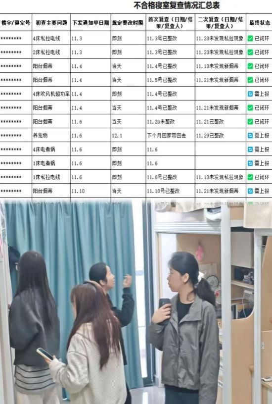 结合学生公寓的实际情况,公寓服务中心制定了详细的迎评工作方案。针对公寓卫生保洁、安全隐患排查、设施设备维护等关键环节,开展了全方位的自查自纠工作,确保安全无死角。评估关键时刻,公寓管家团队对学生寝室开展“地毯式”排查,建立“一寝一档”和问题清单;针对其中“需整改”的寝室,立即下达《寝室整改通知单》,明确时限与标准,在限期结束后实行“回头看”复查,对于反复整改不力的个案,协同书院进行联动教育;同时通过消防应急演练、消防应知应会培训讲座等形式,进一步提升学生安全防范意识。