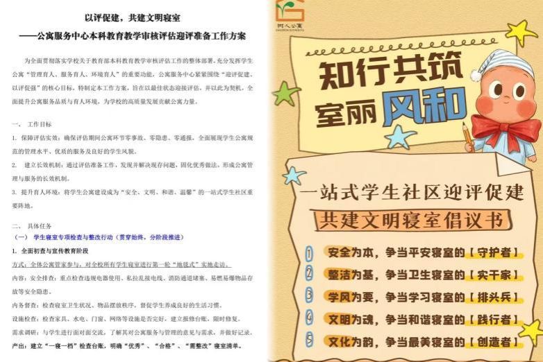 为全面贯彻落实学校关于教育部本科教育教学审核评估工作的整体部署,公寓服务中心积极行动,紧扣“迎评促建、以评促强”核心目标,将评估工作视为提升管理效能与服务品质的重要契机,从安全保障、服务优化、氛围营造三大维度精准发力,扎实推进各项迎评准备工作,以实际行动为学校评估工作筑牢公寓防线。