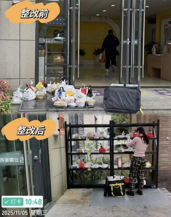 同时,中心联合校园外卖配送团队召开专题会议,吸纳学生意见,明确统一着装、入校登记等规范,增设外卖存放架实现“外卖不落地”,并建立“学生监督员—公寓管理员”双监督机制;在车辆管理方面,同步协同保卫部门,发挥学生社区助理作用,规划学生车辆停放区并现场引导,以规范治理筑牢迎评基础。