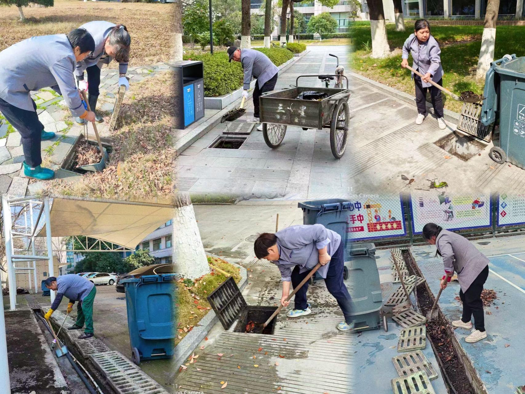 针对落叶量大的情况,保洁人员增加清扫频次,从清晨开始动态保洁,确保路面落叶及时清理。同时,重点对校园下水窨井、排水口进行逐处排查,彻底清理内部堆积的落叶杂物,保障排水通畅,从源头杜绝积水、路滑等安全隐患,为师生出行筑牢安全屏障。