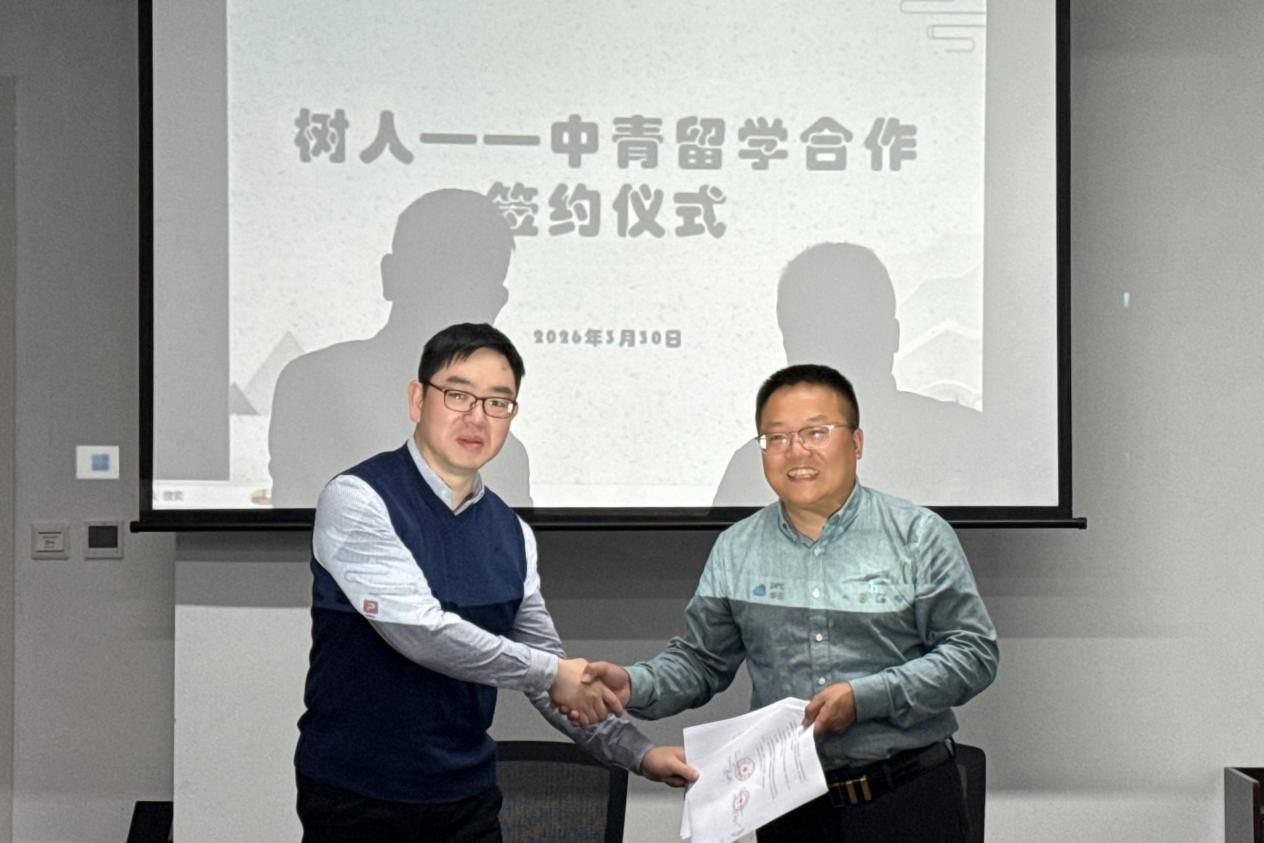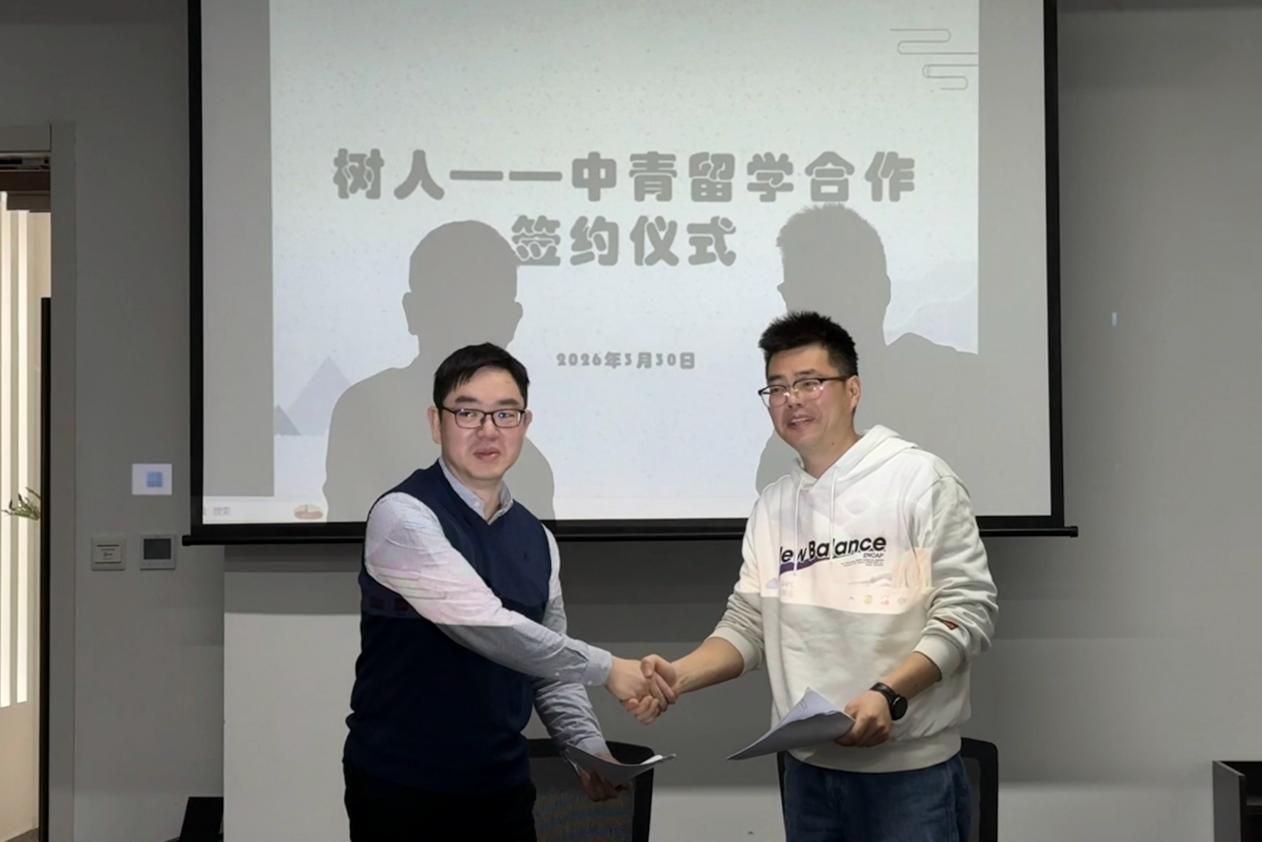 为进一步拓宽学子升学路径,服务学校国际化发展战略,全方位提升人才培养质量,2026年3月30日,树人出国留学公司与中青留学战略合作签约仪式在拱宸桥校区顺利举行。后勤公司总经理、树人留学执行董事吴汉龙,副总经理郑红明,树人留学副经理褚园园,浙江浙思中青出国留学服务有限公司CEO储旦,顾问总监赵思洁,项目经理徐展等双方代表出席仪式。