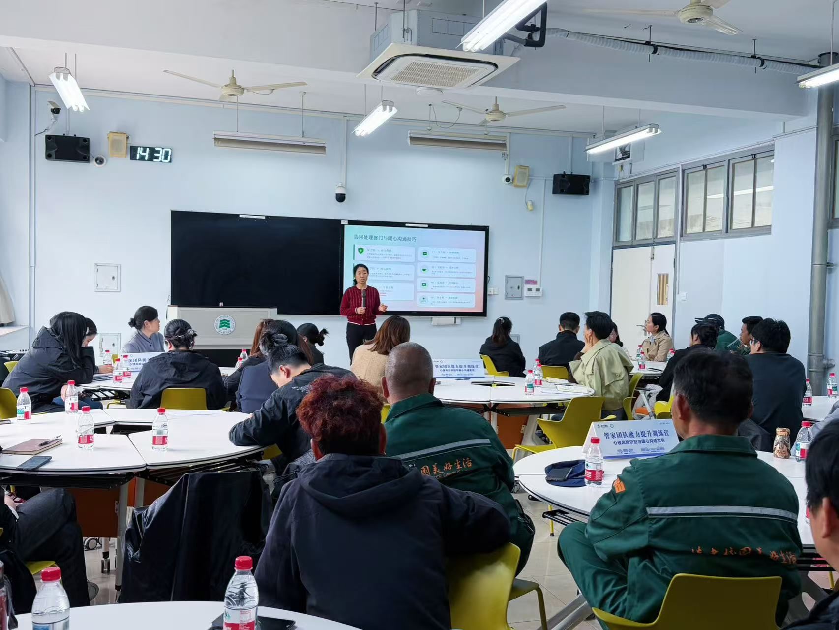 为持续推进物业“三化”建设,落实“健康第一”教育理念,4月15日下午,管家团队能力提升训练营正式开营。本次培训由物业会务中心携手心理中心共同举办,特邀中国心理学会临床心理学注册心理师陈洁老师授课,围绕“心理风险识别与暖心沟通实务”主题开展专题培训。中心主任陈挺挺带队,两校区全体物业管家、优秀一线员工代表及综合事务办公室等兄弟部门代表共计近60人参与本次培训。