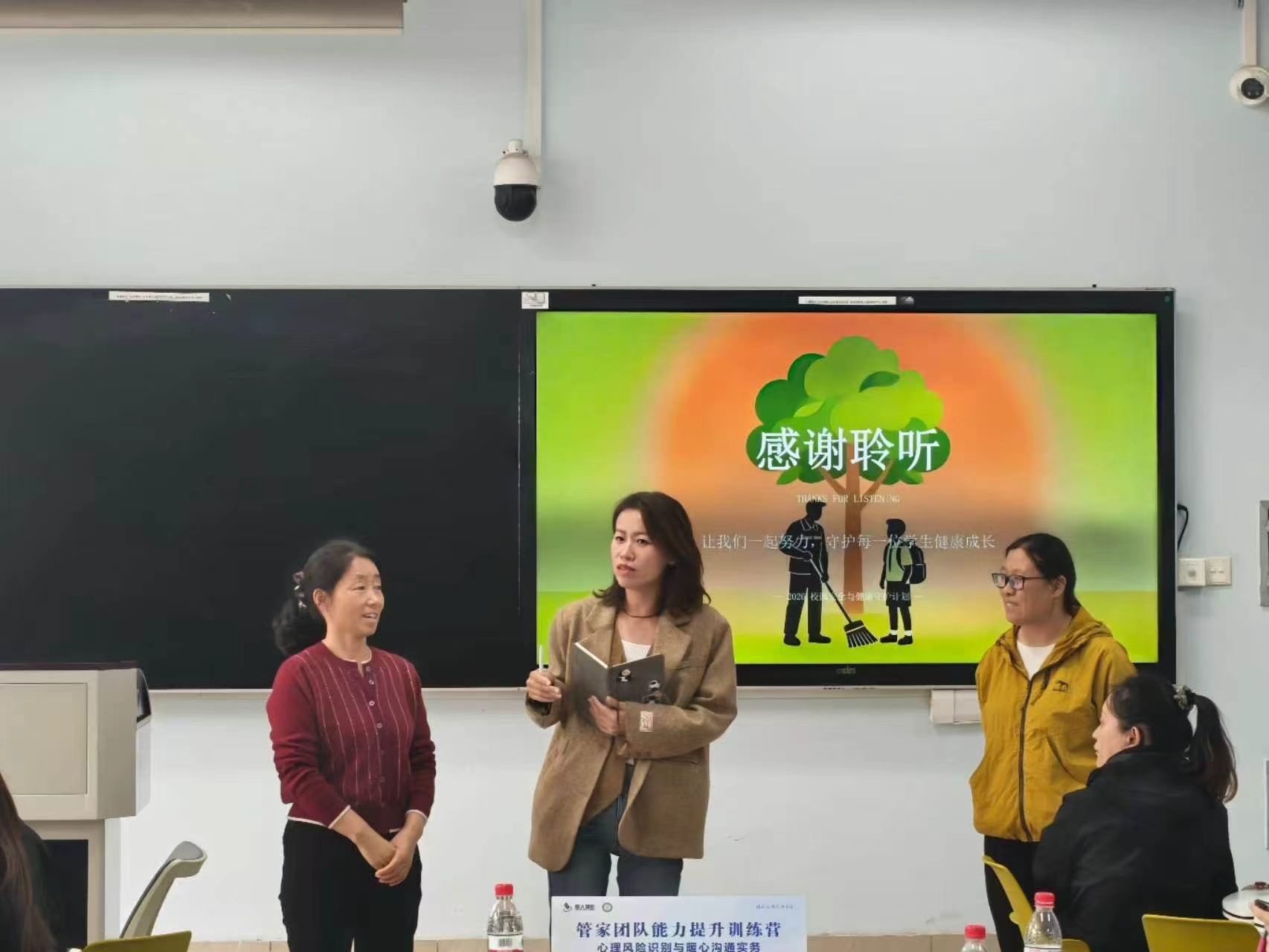 培训尾声,中心主任陈挺挺作总结发言。她指出,后勤团队是校园服务的重要力量,心理健康素养与危机应对能力直接关系到服务品质与校园安全。本次培训为后勤队伍注入了专业的心理服务能量,希望全体参训人员能将所学知识内化于心、外化于行,把暖心服务、心理关怀融入后勤保障全流程。为构建平安和谐校园、助力学生健康成长筑牢坚实防线。